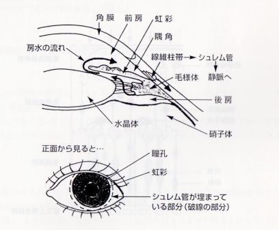 上図のように房水は虹彩の後ろ側で水晶体のまわりを循環してから、瞳孔を通って虹彩の前に出て、虹彩と角膜の間(前房)を循環する。水晶体と角膜から老廃物を受け取った房水は、角膜と虹彩の間(前房隅角)にある繊維柱帯というフィルターのような網目状の組織を通り、シユレム管という管に集められて眼球の外の静脈に排出される。